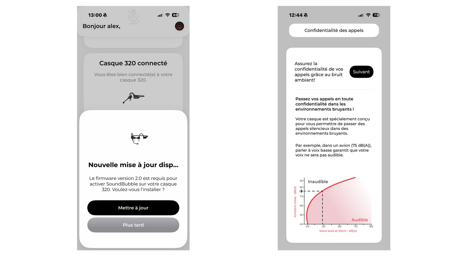 Sur notre iPhone, la configuration n’a pas non plus nécessité de s’arracher les cheveux ; tout juste le processus de mise à jour qui a été suggéré dès la mise en service a du être recommencé, la première tentative s’étant bloquée dès le départ. Une fois installée, l’app permet de gérer les paramètres du casque et d’apprendre à parler aussi bas que possible de manière naturelle grâce à un tuto embarqué.